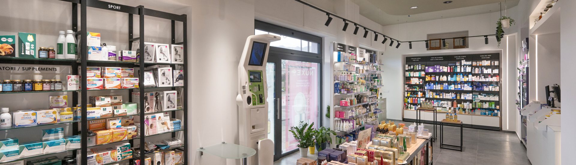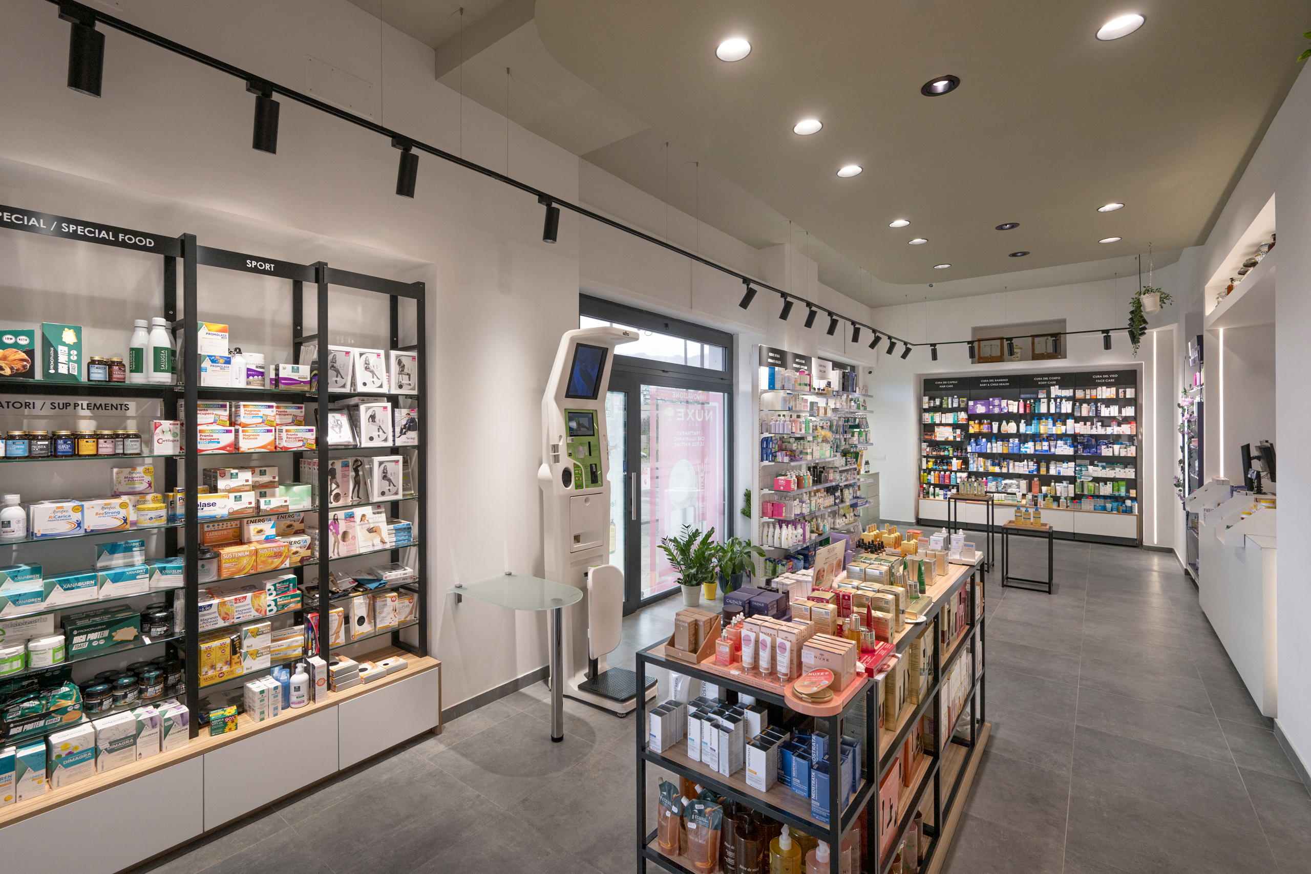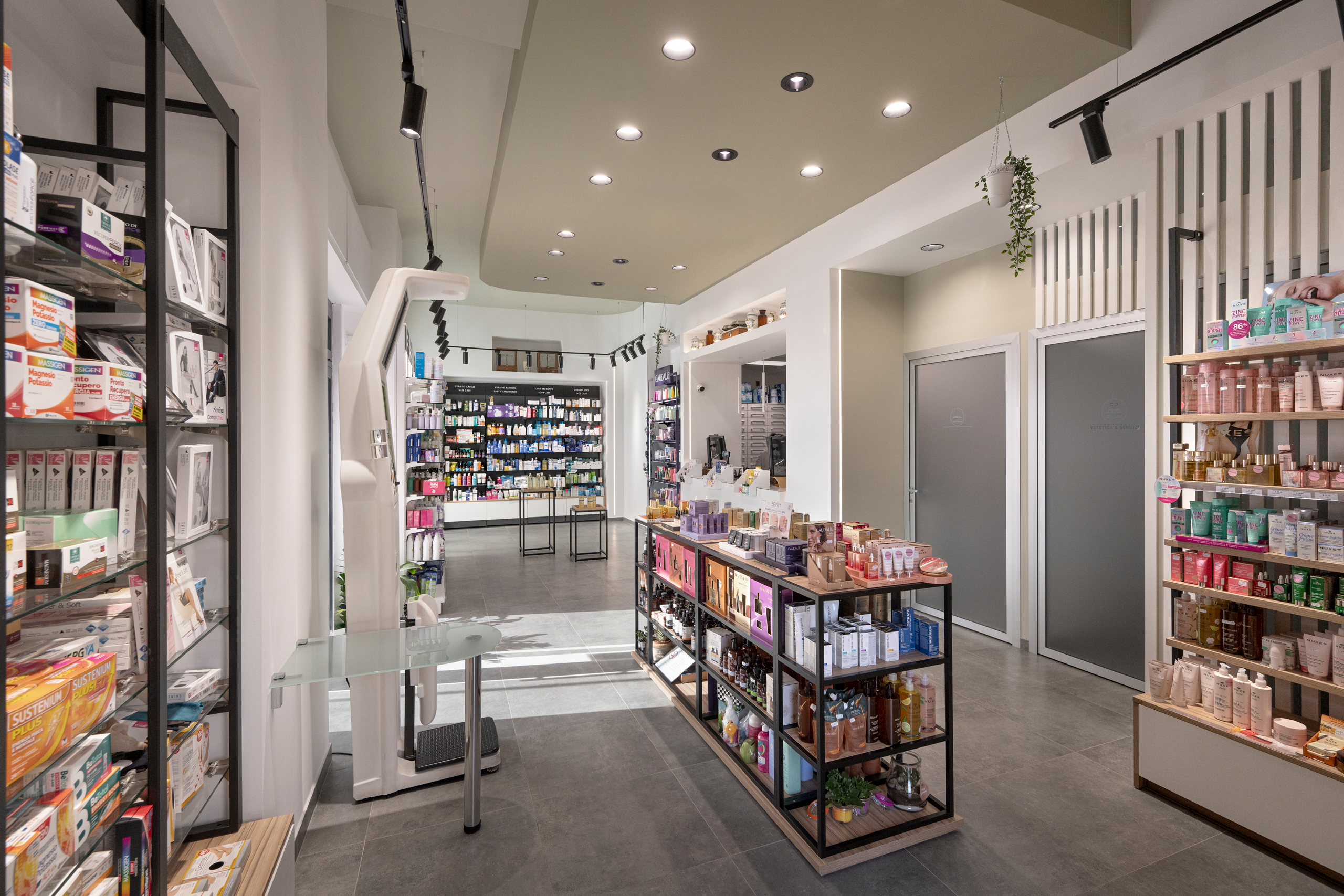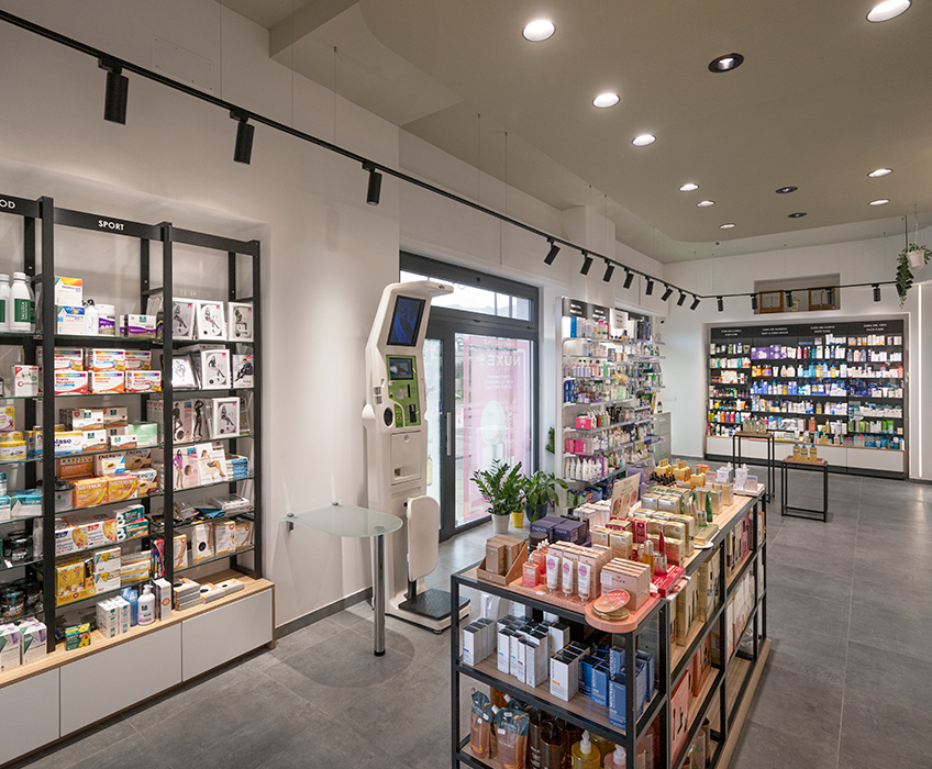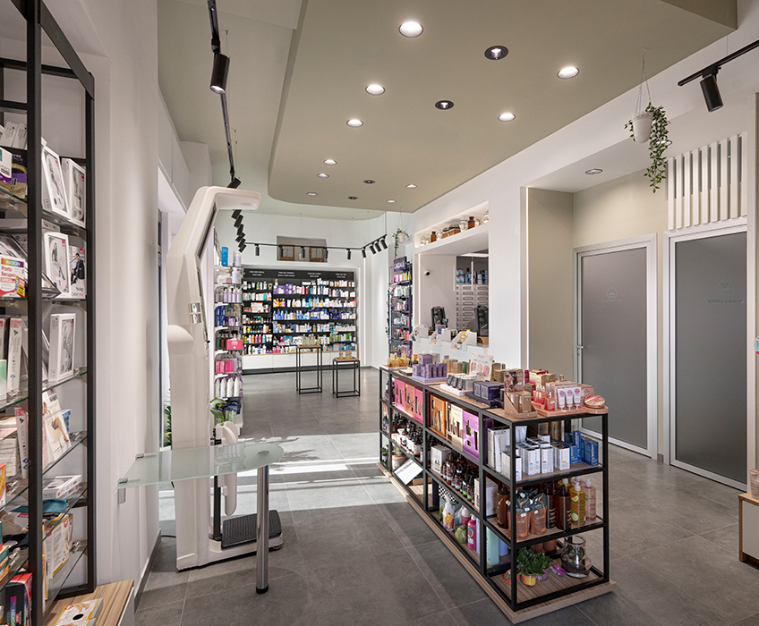 La farmacia si sviluppa su una base sobria e contenuta, in cui il bianco, il grigio e il nero definiscono un linguaggio chiaro, accompagnati dal calore discreto del legno.